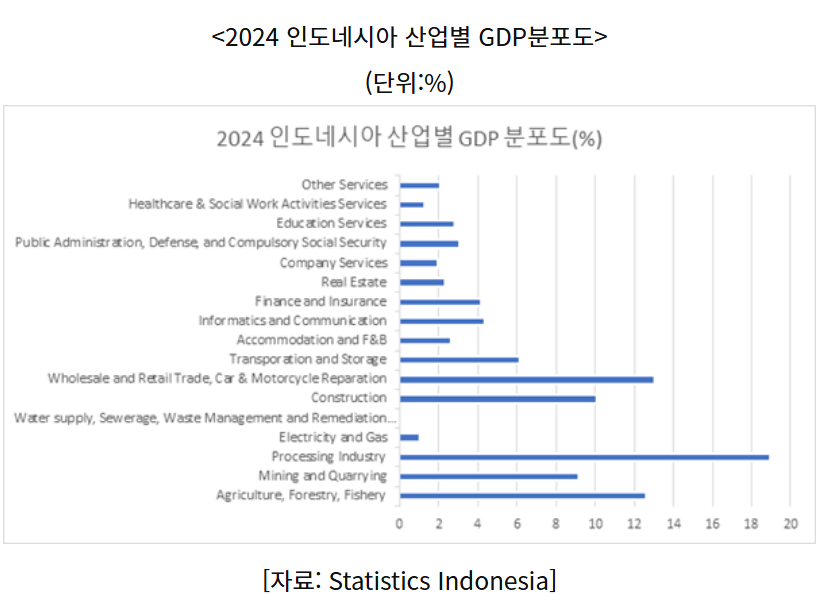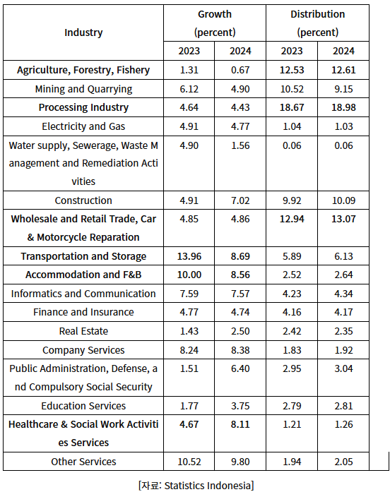 현재 가격을 기준으로 할 때, 2024년 GDP의 산업별 분포는 다음과 같다. 인도네시아 GDP에서 가장 크게 기여한 산업분야는 제조업으로 약 18.98%를 기록하였으며, 도소매업과 농수산임업이 그 뒤를 따랐다. 가장 높은 성장률을 보여준 산업은 교통(물류) 및 창고업이며, 호텔 및 식음료 산업과 헬스케어가 그 뒤를 따랐다. 신정부 취임 후 100일간의 주요 정책 이슈