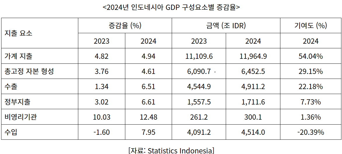 2024년 인도네시아 GDP 지출 구성 요소를 살펴보면, 가계 지출과 총 고정 자본 형성이 주요 기여 요소로, 그 기여도는 전체의 83.19%에 이른다. 2024년도 비영리 기관 가계(NPISH)의 높은 성장률은 2024년 대통령 선거 및 지방 선거 동안의 활동 증가에 의해 영향을 받았다. 2024년 가계 지출의 성장은 가계의 활동 및 이동성이 증가함에 따라 이루어졌다. 높은 지출은 교통 및 통신 부문에 집중되었으며, 높은 이동성은 교통 및 통신에 대한 수요를 창출하여 철도, 해상 및 항공 교통에서 승객 수가 증가한 것으로 나타났다. 또 다른 높은 지출 항목은 식당 및 호텔로, 특히 방학 및 종교적 휴일 동안의 휴가 활동 증가에 의한 것으로 분석된다.