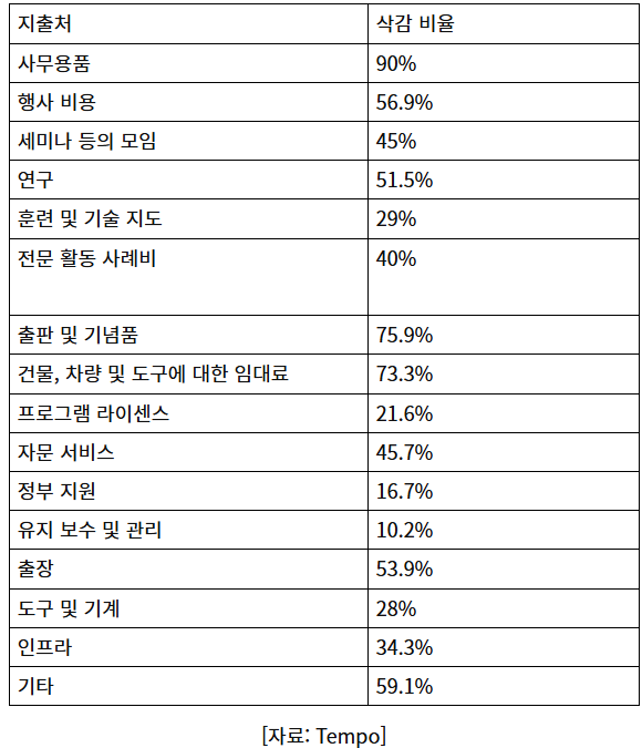 대통령 지침 이후 재무부의 서한 제S-37/MK.02/2025가 발행되었으며, 예산 삭감의 세부 사항은 다음 표와 같다. 부처별 예산 삭감은 다양하지만, 아래는 비율 기준으로 가장 큰 삭감을 받은 5개 부처/기관의 목록이다. 특히, 예산삭감률이 큰 공공사업부는 고속도로 등 국가의 중요한 인프라 건설 프로젝트를 담당하고 있어 관련 프로젝트들의 지연 등이 예상된다.