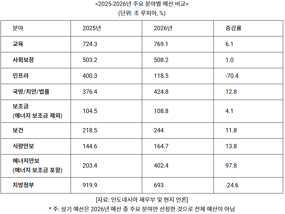 2026년 지출 예산은 전년 대비 6.1% 증가한 3,842.7조 루피아로 역대 최대 규모이다. 금번 지출 예산안의 가장 큰 변화는 지난 10년간 집중 투자했던 인프라 분야에 대한 예산을 대폭 삭감해 교육, 보건, 식량안보 등 정부의 우선순위 정책을 지원하는데 재분배한 점이다. 이러한 변화는 신 정부의 인적 자본 개발과 식량 및 에너지 자급자족 공약을 이행하기 위한 전략적 전환으로 무상 급식 확대 및 국방 현대화 등을 통해 장기 성장 기반을 강화하려는 의도를 반영한 것으로 평가된다.